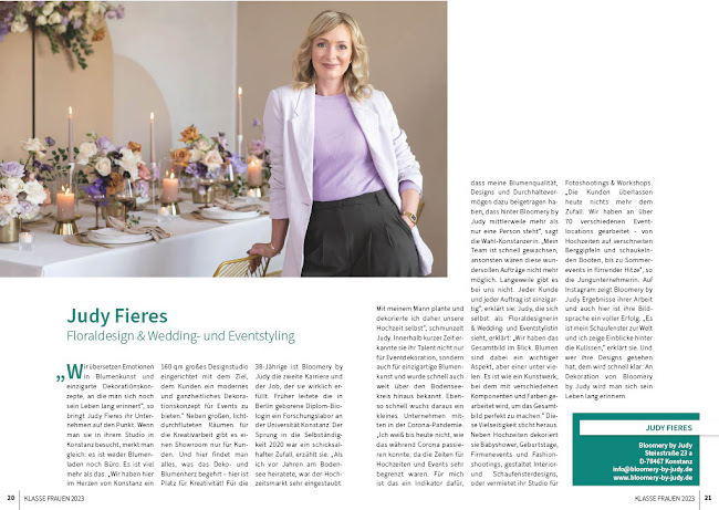 Wir haben Judy zum ersten Mal auf einer Hochzeitsmesse entdeckt und uns sofort in sie und ihre wahnsinnig gute Arbeit verliebt!! Nachdem ich ihr unser Interesse gesagt habe, ging auch alles schon ganz schnell. Wir haben geschrieben, uns dann getroffen, alles miteinander besprochen und sie hat den Auftrag für uns zusammengefasst und ein Angebot geschrieben. Die ganze Vorbereitung unserer Hochzeit lief sich ca. auf 1,5 Jahre und Judy war in der Zeit unsere treue Begleiterin. Ich konnte sie immer fragen und hatte das Gefühl, dass sie nicht mehr „nur“ meine Floristin war. Gerade in der Corona Phase hatten wir es besonders schwer, wobei sie in einer TelKo mit uns, uns extrem unterstützt hat. Judy hat uns Ideen gebracht und war absolut flexibel, was unsere endgültige Hochzeitsplanung betraf. Sie hat unsere Wünsche nicht nur angenommen, sondern tatsächlich präzise umgesetzt. Wir haben ihr in ihrer Arbeit absolut vertraut und waren sehr beeindruckt. Am Ende hatten wir eine etwas größere Gartenhochzeit. Judy kam von Konstanz zu uns nach Lindau, sie hat unser Zelt, die Terrasse und die Wohnung vollkommen verzaubert. Nicht nur wir waren hin und weg von ihr. Ich kann Judy nur weiterempfehlen, in ihrer kompetenten und genauen Arbeit, sowie auch in ihrer Zwischenmenschlichkeit und ihrer feinfühligen Art im Umgang mit ihren Kunden.
